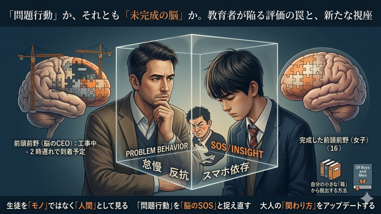 日々生徒と向き合う中で、特に男子生徒に対してこのような徒労感を抱くことはないでしょうか。期限を守らない、衝動的に動く。こうした姿を前にしたとき、私たちは無意識のうちに彼らを「だらしない生徒」「やる気のない子」という**歪んだ「箱」**に押し込めてしまいがちです。